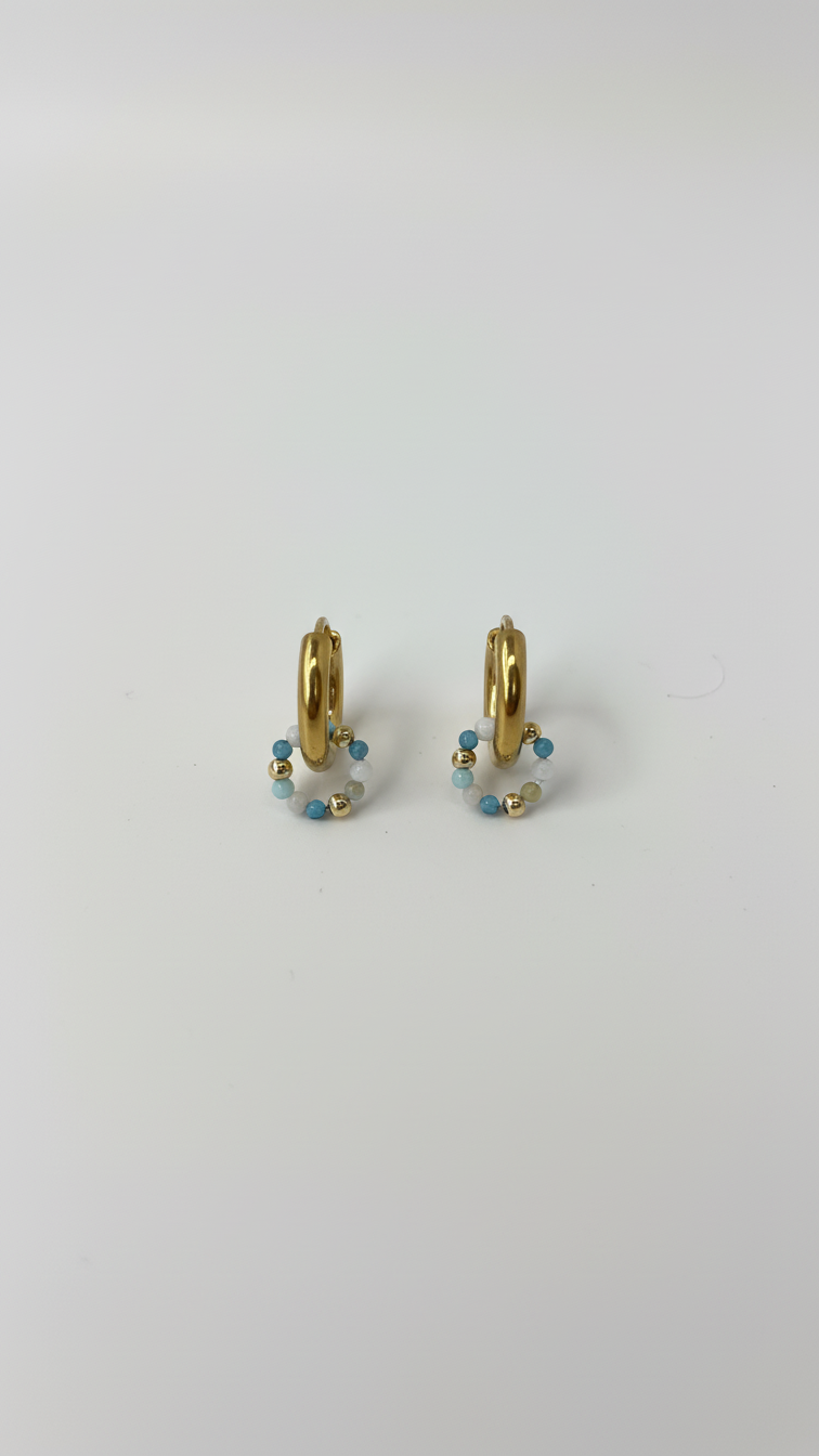 Die kleinen Edelsteinperlen sind zu einem zarten Kreis arrangiert und erinnern an schimmernde Wassertropfen im Sonnenlicht. Goldene Akzentperlen setzen feine Highlights und harmonieren perfekt mit der warmen Goldfarbe der Creole.