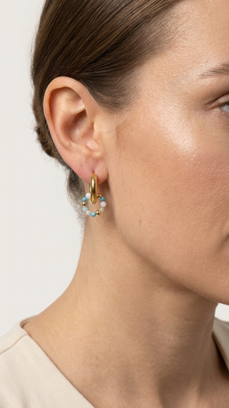 Die Ocean Breeze Creolen bringen die frische Leichtigkeit des Meeres in dein Schmuckkästchen. Die eleganten Creolen aus vergoldetem Edelstahl werden durch einen handgefertigten Anhänger aus Edelsteinperlen in sanften Aqua- und Weißtönen ergänzt – inspiriert von den Farben des Ozeans.